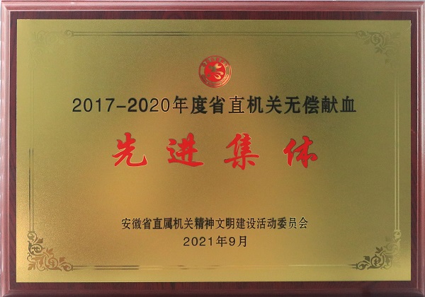 近日,安徽省直机关精神文明建设活动委员会发布了《关于省直机关无偿献血先进集体、先进个人的表彰通报》,从128家省直机关单位中,评选并授予时搏一站式服务官网等23个单位“2017-2020年度省直机关无偿献血先进集体”荣誉称号。同时,时搏一站式服务官网刘村、王宝全获得“省直机关无偿献血先进个人”荣誉称号。