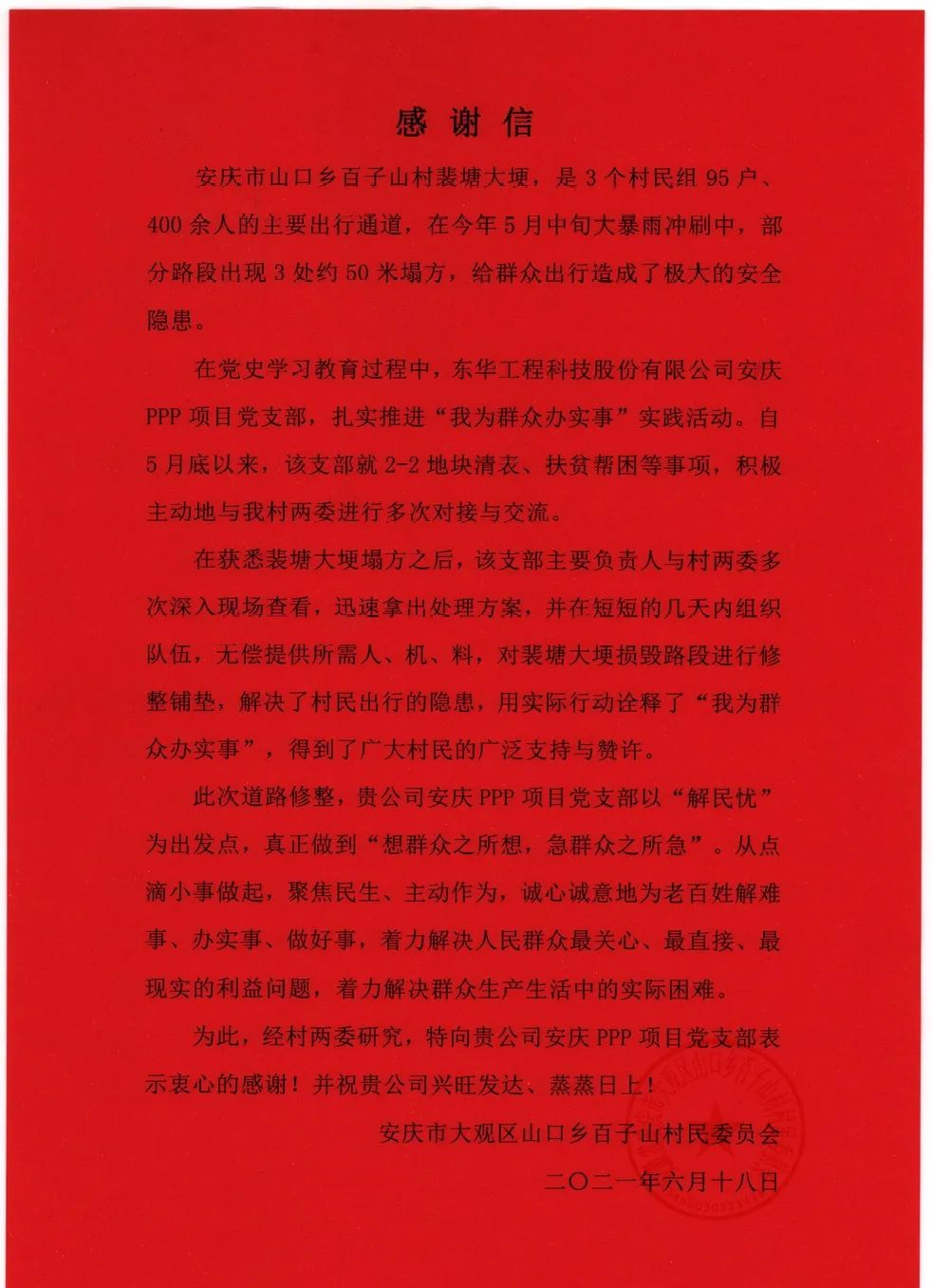 此次道路修整,安庆项目党支部以“解民忧”为出发点,真正做到“想群众之所想,急群众之所急”。从点滴小事做起,聚焦民生、主动作为,诚心诚意地为老百姓解难事、办实事、做好事,着力解决人民群众最关心、最直接、最现实的利益问题,着力解决群众生产生活中的实际困难。