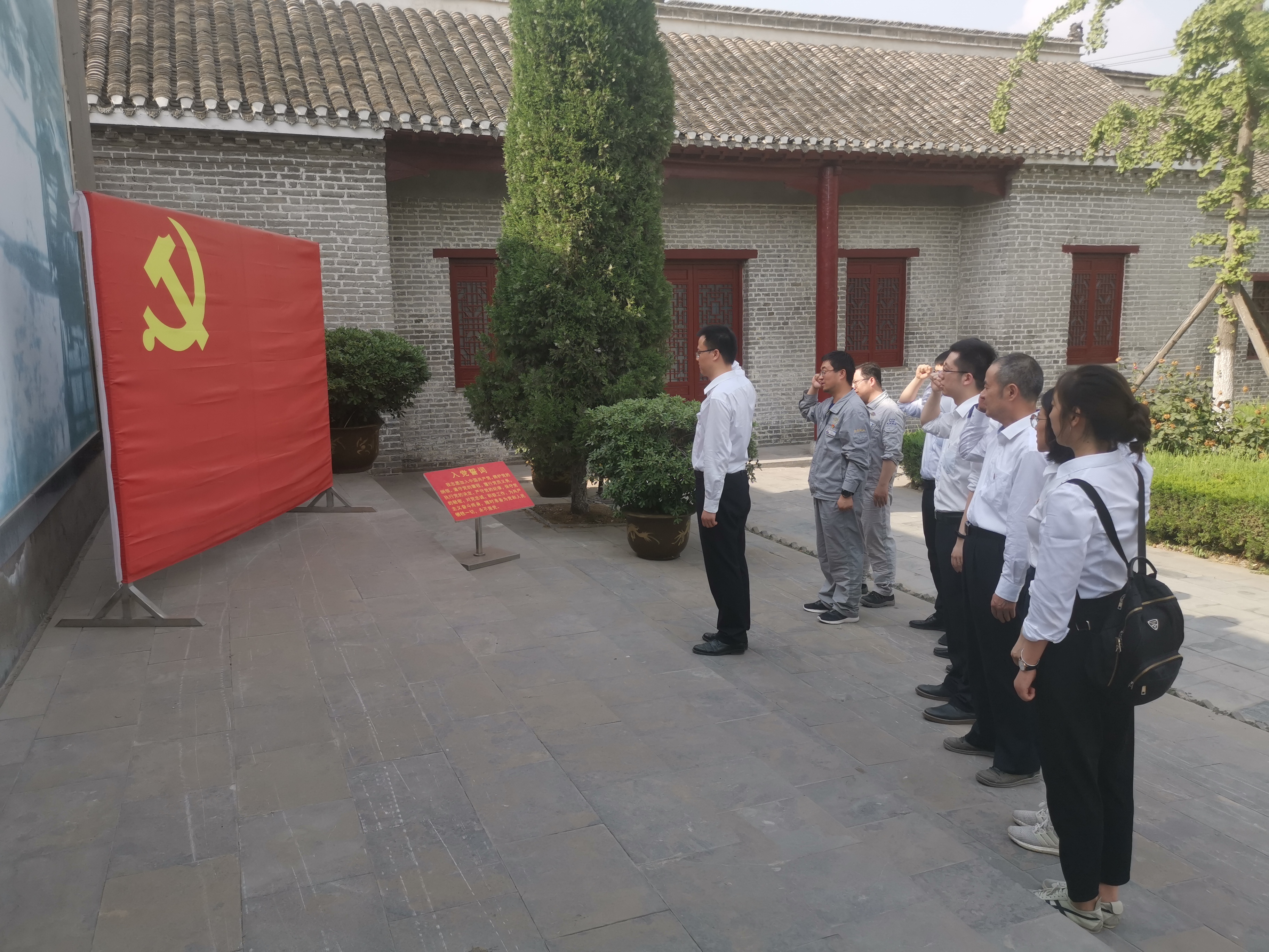 下午,双方支部成员一同前往张菜园村淮海战役总前委旧址纪念馆参观学习,在了解了淮海战役的光辉历程后,卢洋在展馆里以“重温红色历史,感悟红色精神”为题,给大家讲授了一堂别开生面的党课,回顾红色精神,弘扬革命传统。最后,在庄严的党旗下,双方支部党员重温了入党誓词。