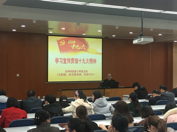 近来,公司上下掀起全面学习宣传贯彻党的十九大精神热潮。11月24日上午,第十四党支部在B楼报告厅召集文控部、技术质量部、信息中心全体员工集中学习党的十九大精神,同时也为下午全员更好收看中央宣讲团成员、十九大报告起草组成员施芝鸿同志在集团公司宣讲党的十九大精神视频做好准备。