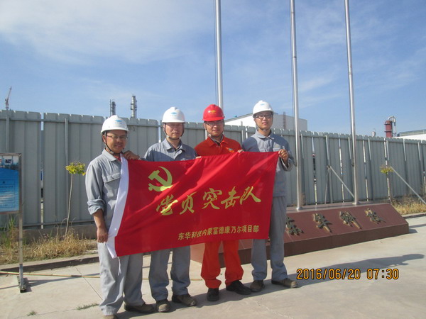 为此,第十六党支部成立内蒙富德康乃尔项目“党员突击队”,新疆天盈项目“党员突击队”,设立“共产党员示范岗”。要求支部在公司总包项目生产一线的党员同志,敢于亮出党员身份,践行共产党员先锋模范作用。党员走到哪里,都是一面旗帜,“我是党员,从我做起,向我看齐”。