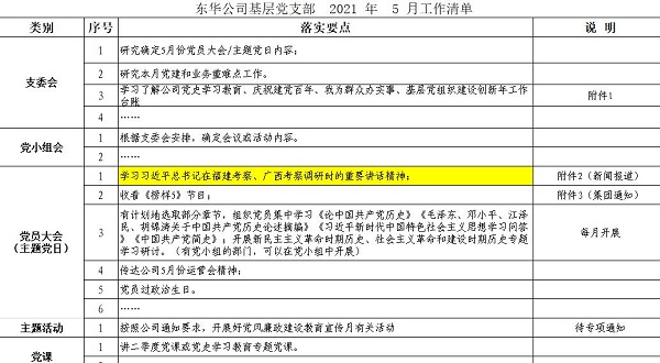 时搏一站式服务官网党委积极响应相关工作部署和要求,及时将习近平总书记在广西考察期间重要讲话精神作为党史学习教育的一项重要内容。5月6日,五一假期后上班第一天,公司党委就将《习近平总书记在福建考察、广西考察调研时的重要讲话精神》纳入了《东华公司基层党支部2021年5月份工作清单》并向各基层党组织发起学习研讨任务要求。