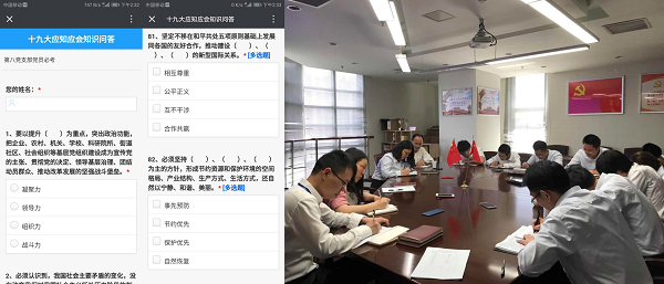 此次党章和党的十九大精神应知应会知识测试,紧密围绕党章和十九大报告,包含了中国共产党的历史使命、习近平新时代中国特色社会主义思想和党的执政能力建设等要点,内容全面,题型多样。创新引入手机端答题方式,单选题、多选题均在“时搏一站式服务官网第八党支部”公众号上答题,支部参与率100%,并实时显示用时、成绩及排名,简答题的笔试安排在A705会议室进行。