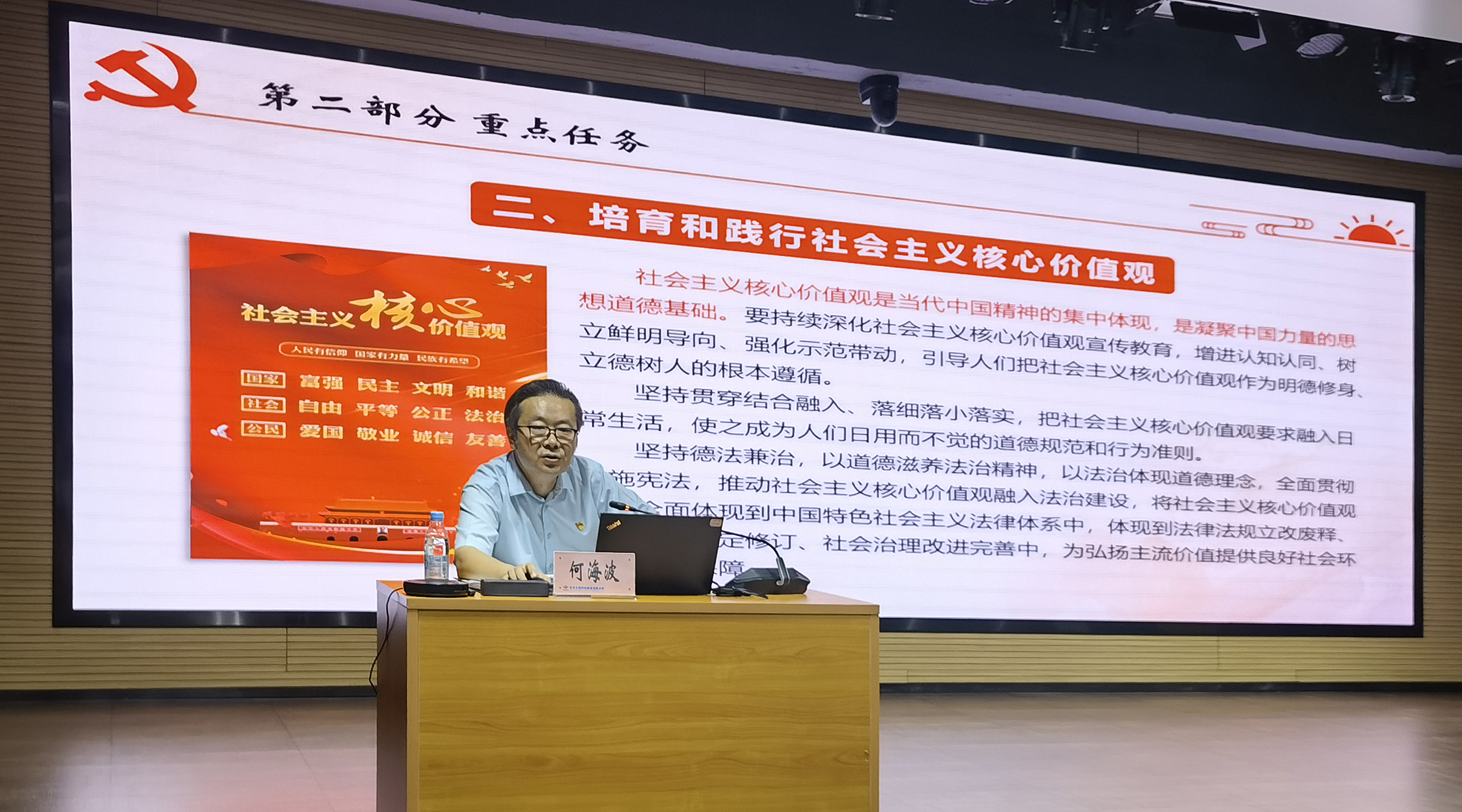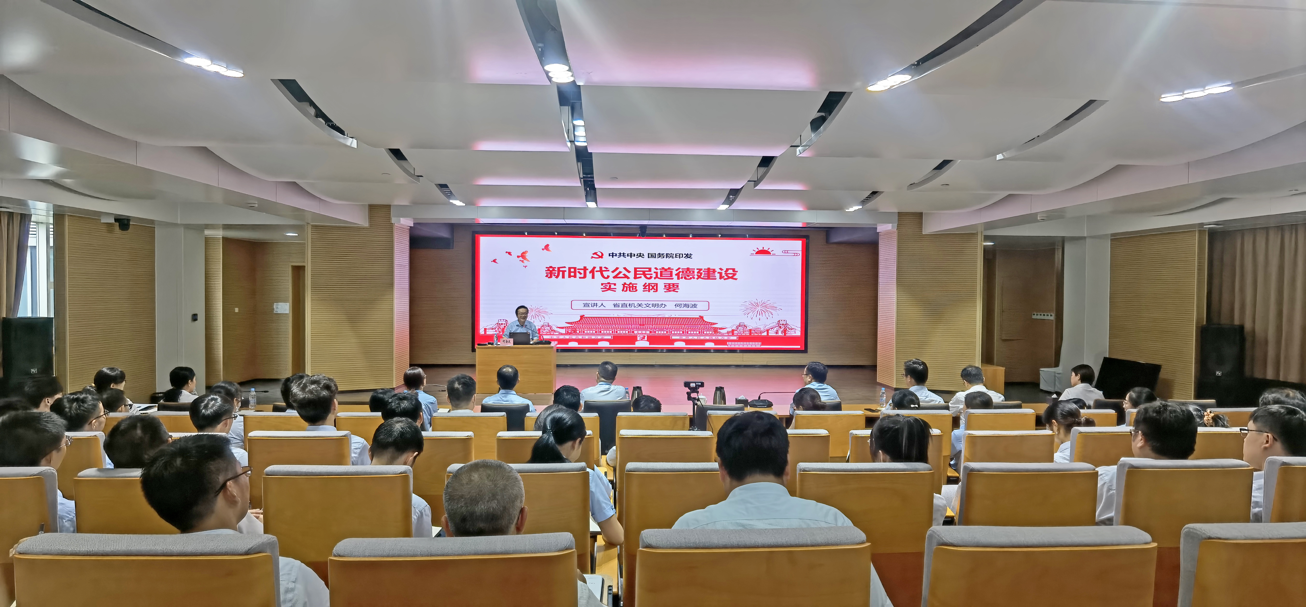 何海波结合新时代要求,深入阐述了《新纲要》出台的背景意义和主要特点,对总体要求、重点任务、深化道德教育引导、推动道德实践养成、抓好网络空间道德建设、发挥制度保障作用、加强组织领导七个方面具体内容进行了解读。他从社会公德、职业道德、家庭美德、个人品德层面出发,深入浅出地为大家讲授了一堂有时代高度、有思想深度、有人文温度的精神文明教育课。
